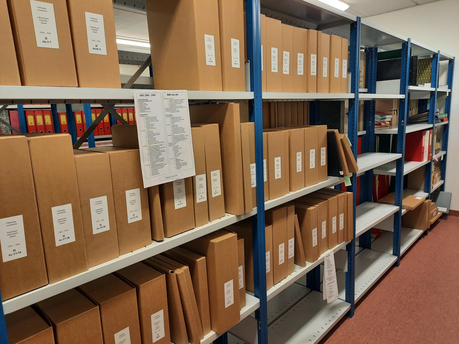 aineiston järjestys ja ajantasaisuus, ams/arkistoluettelo sekä arkistotilat